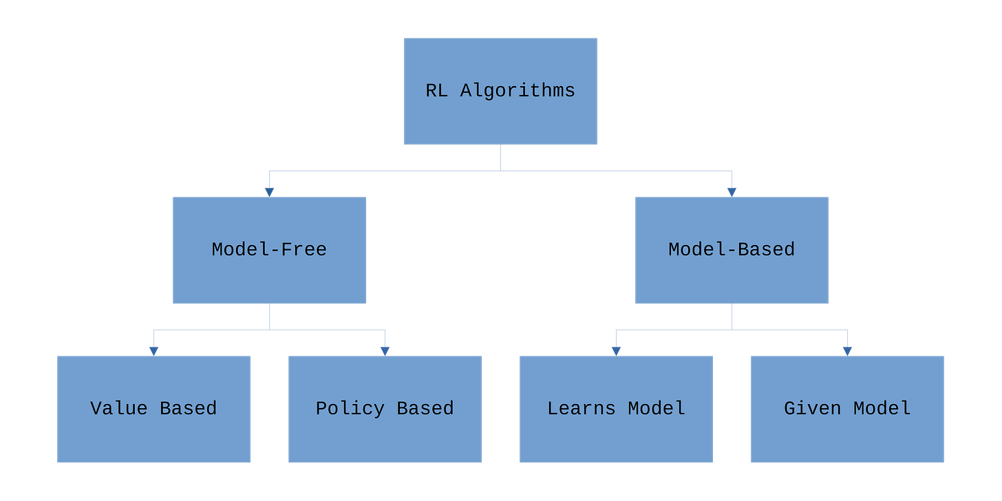 For the purposes of our discussion, we’ll just make the high level distinction between model-free and model-based algorithms.